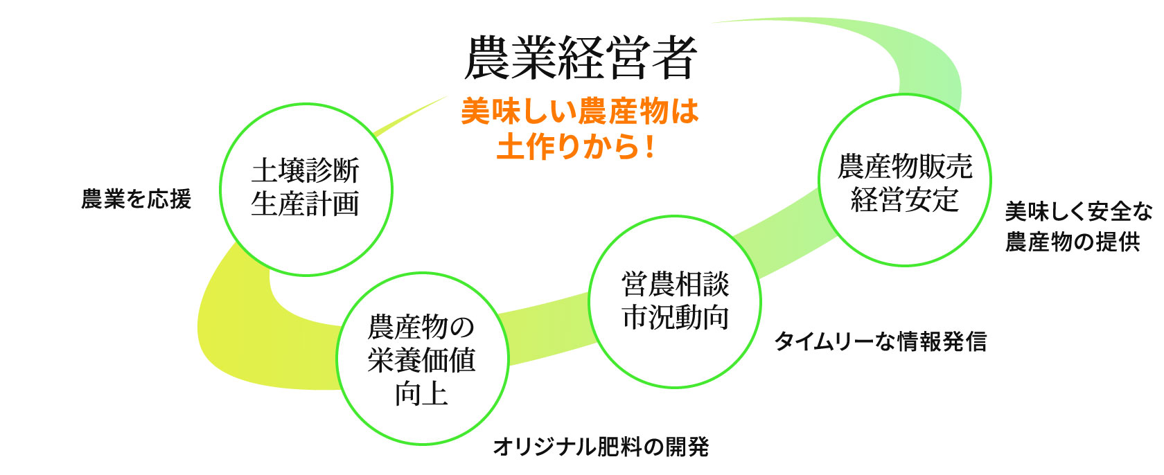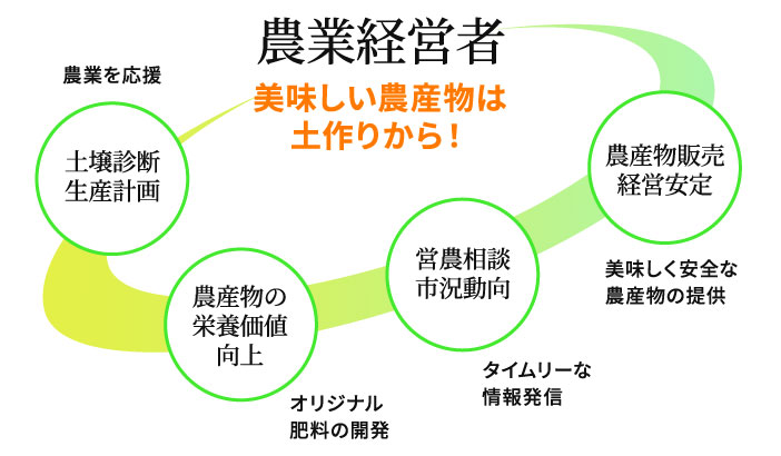 農業経営者の良きパートナーとして、営農相談・土壌診断・施肥設計を行い農業を応援しています。農業の経営についてのご相談、より効率的に農業経営をする為には、